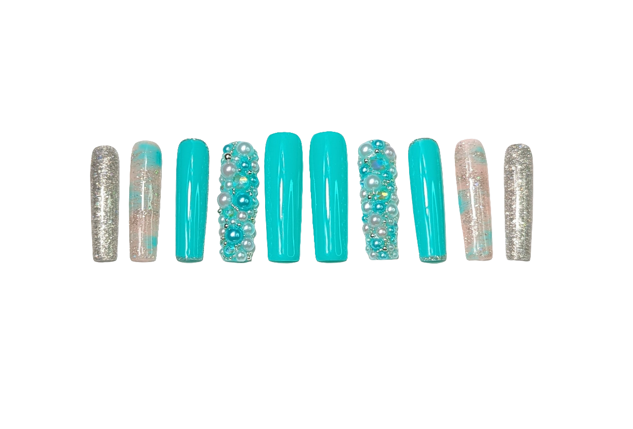 This beautiful teal press on set is in size medium. Nail set includes 10 nails and MB kit.